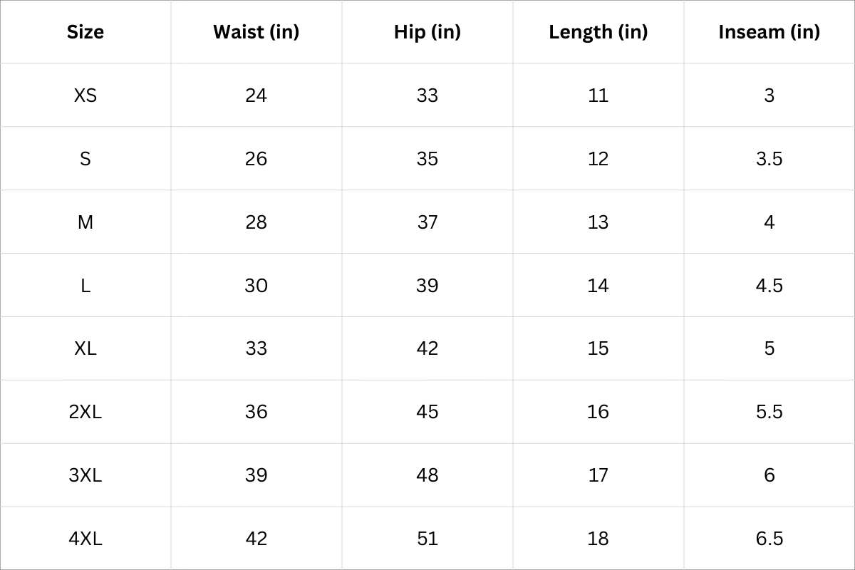 Short Size Chart (Inches):