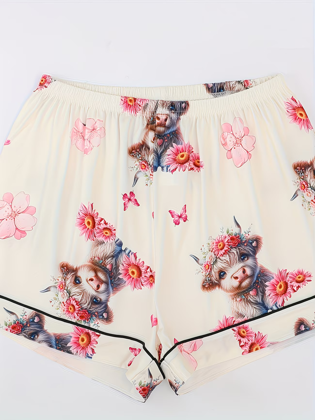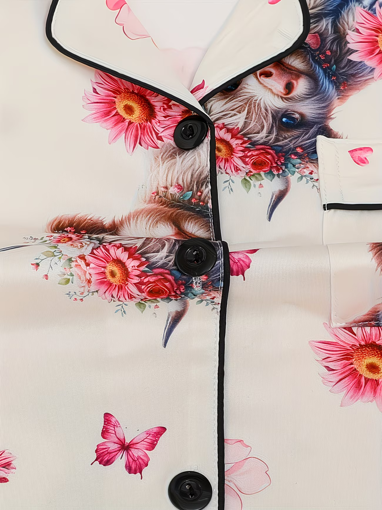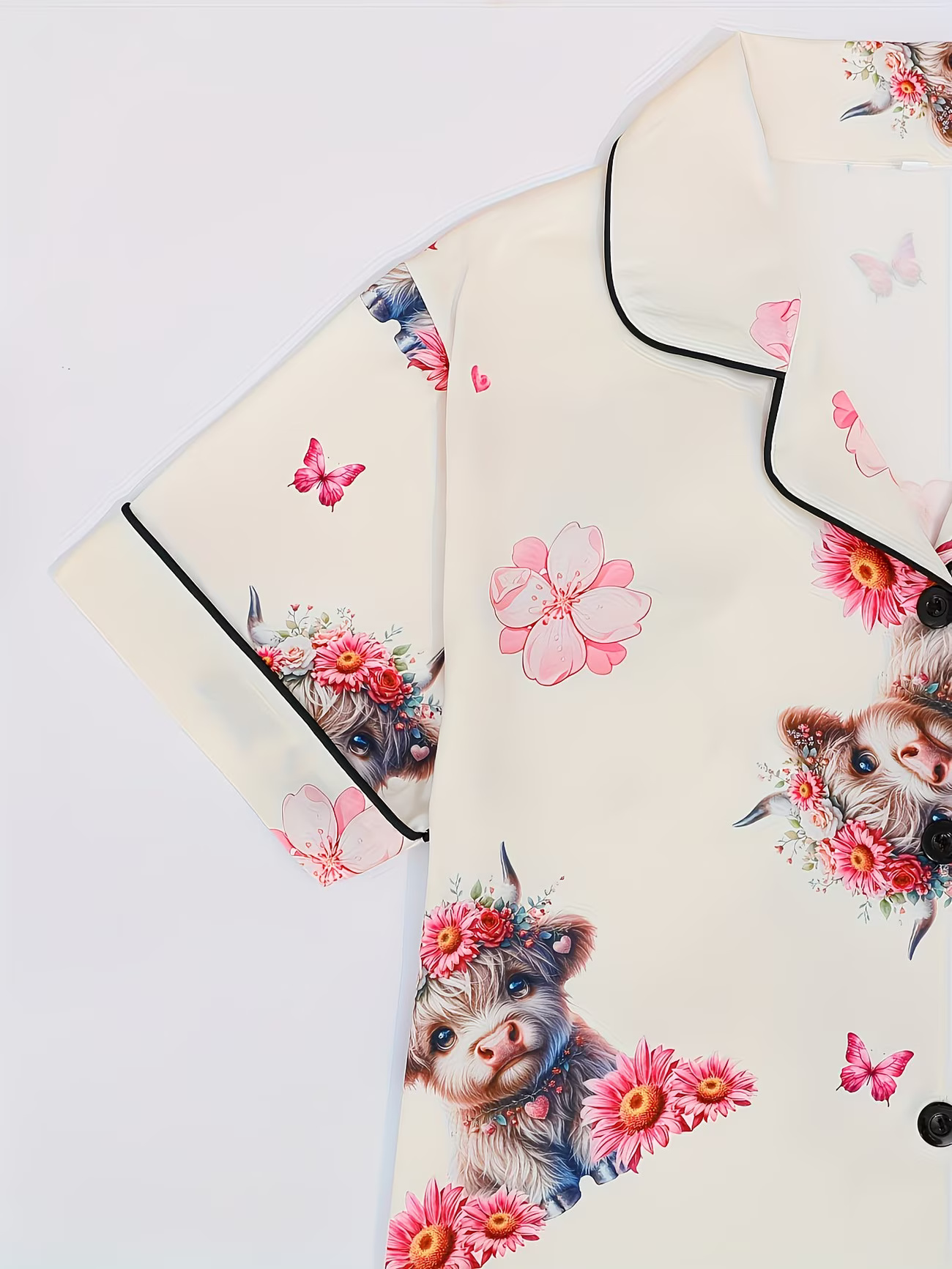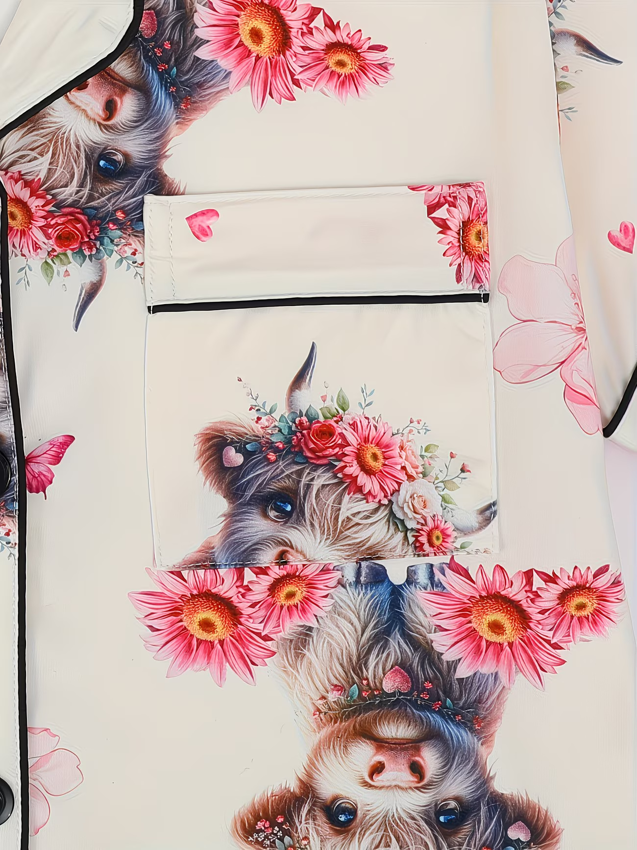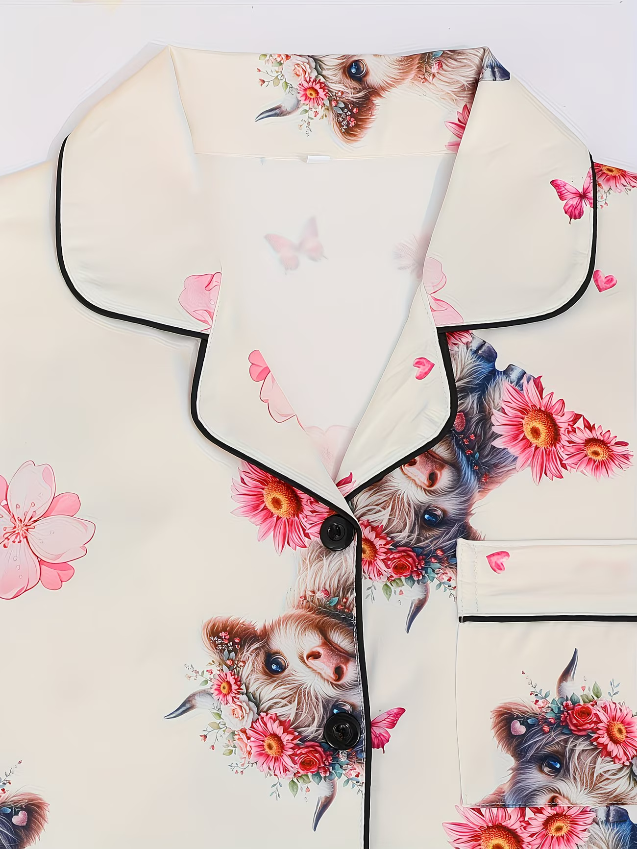 The 3 Piece Cartoon Highland Cow Pajama Sleepwear Set For Women is a coordinated three-piece sleepwear option designed for comfort, flexibility, and everyday indoor wear. This set includes a short-sleeve lapel top with button front detail, matching shorts, and full-length pants. Each piece features a cartoon cow print with floral accents, creating a cohesive and visually appealing design across the entire set.