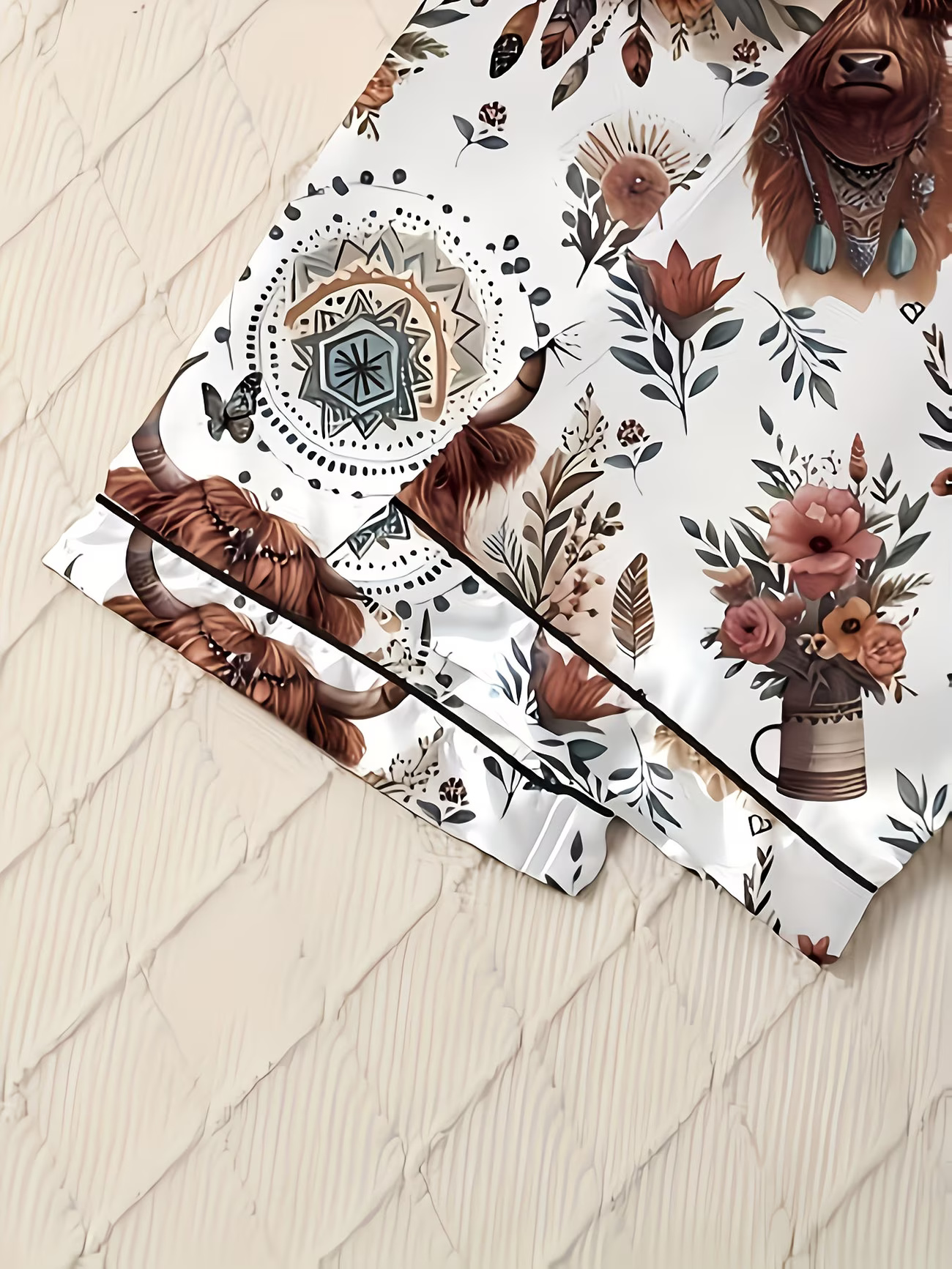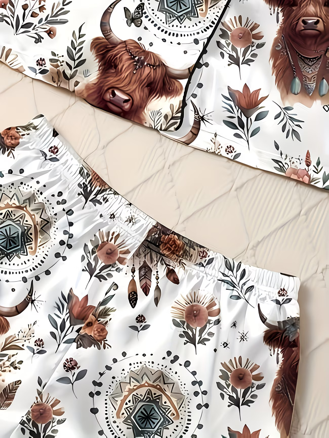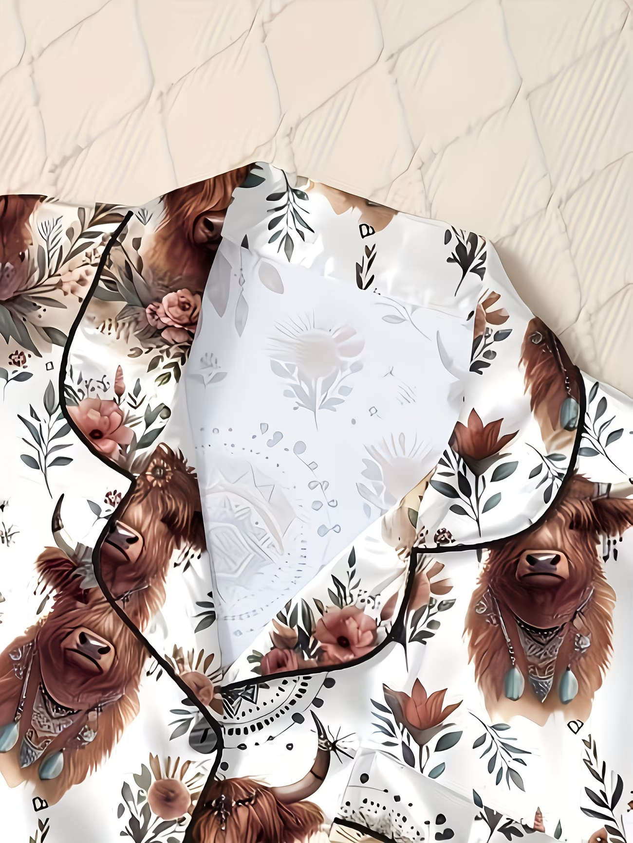 The 3 Piece Floral Highland Cow Yak Home Wear Pajama Set For Women is a three-piece home wear collection designed for coordinated indoor dressing during cooler seasons. Featuring a white background decorated with floral accents and yak illustrations, this set includes a short-sleeve button-front top, matching long pants, and a pair of shorts. The woven construction provides a smooth surface and structured drape, giving the outfit a neat and polished appearance.