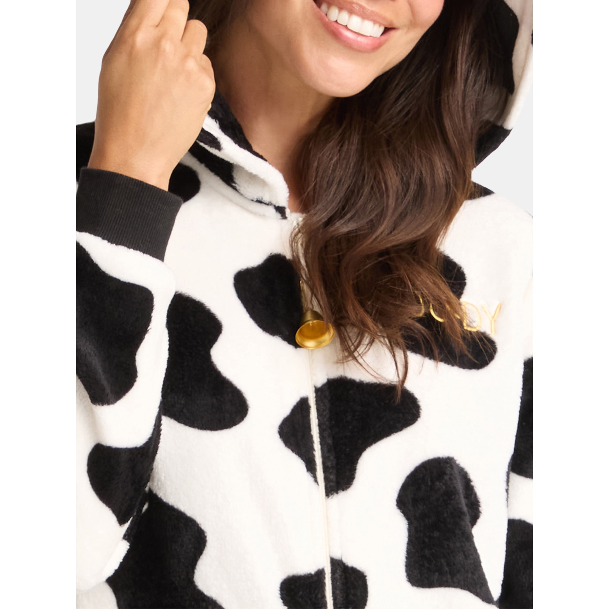 The hood structure adds a themed detail that supports the cow pattern styling. The pattern extends across the entire surface, offering a unified visual. The cuffs at the sleeves and ankles keep the piece structured during movement and maintain the overall silhouette without relying on heavy reinforcements.