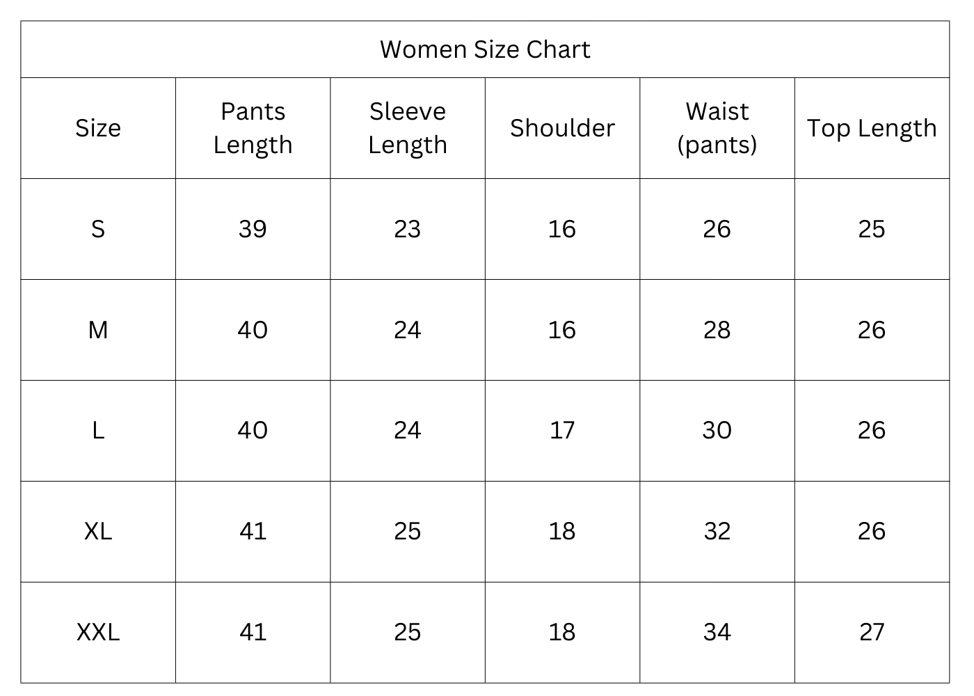 Size Chart (Inches):