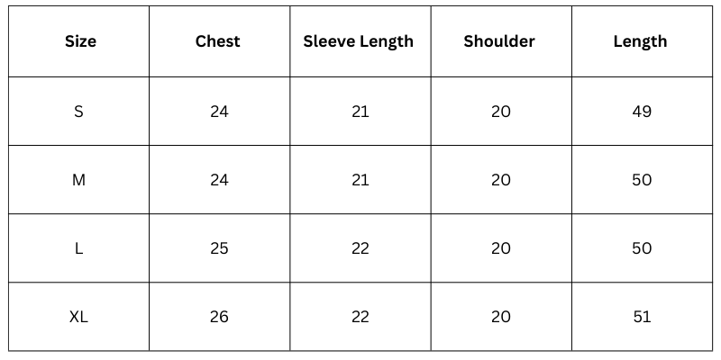Size Chart (inches):![]()