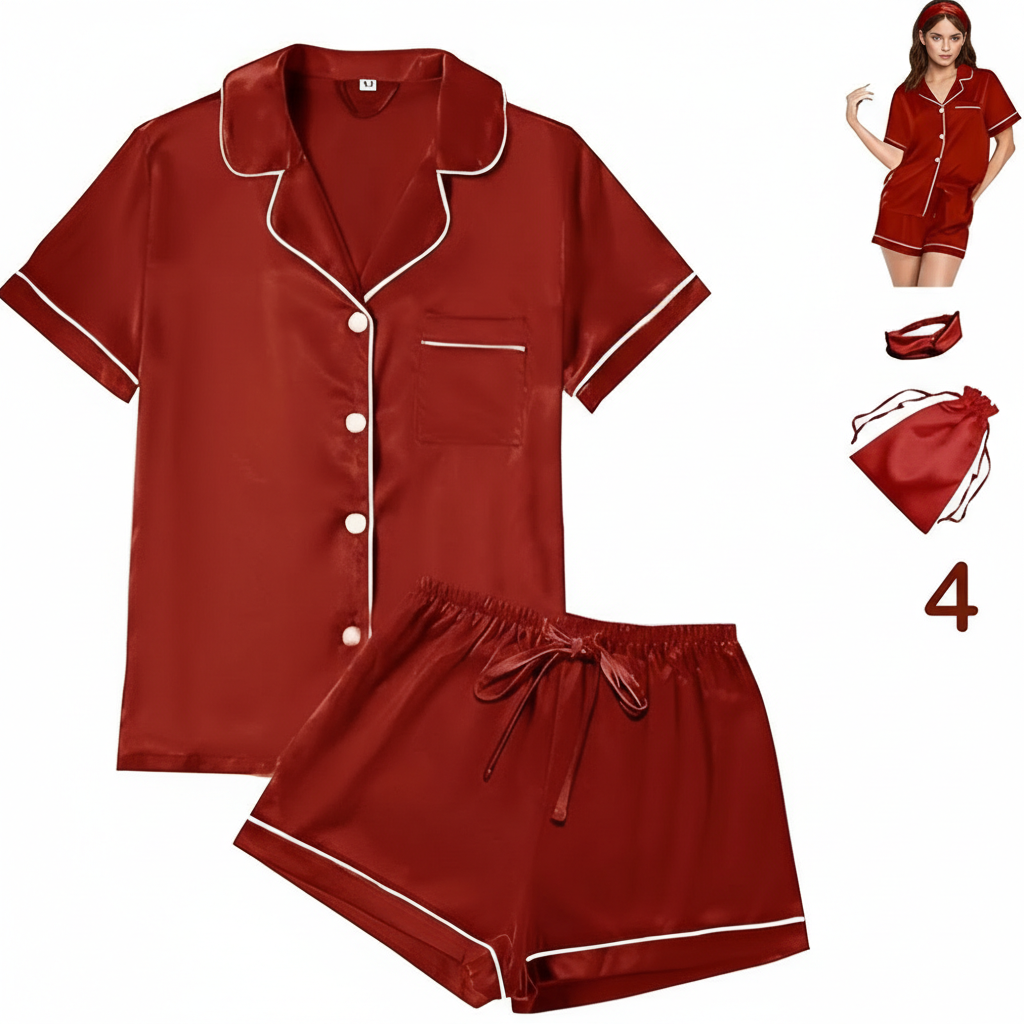Comfort and ease meet in this Four Piece Pajama Set With Short Sleeve Shirt And Shorts For Women, designed for evening wear and home dressing. This collection includes a coordinated short-sleeve shirt, a matching pair of shorts, a soft fabric headband, and a small pouch. The design prioritizes simplicity with soft structure and style that suits quiet hours indoors.
