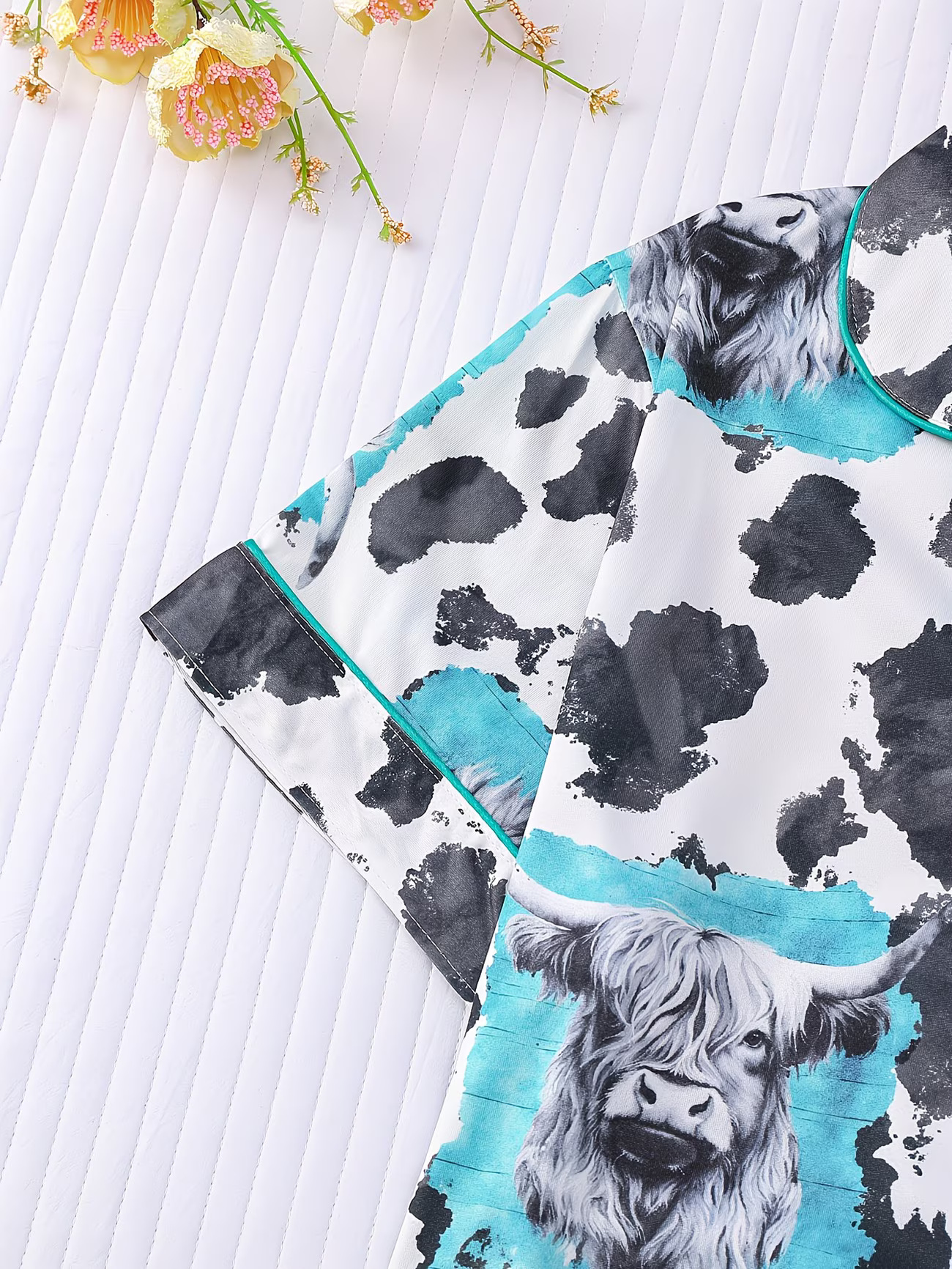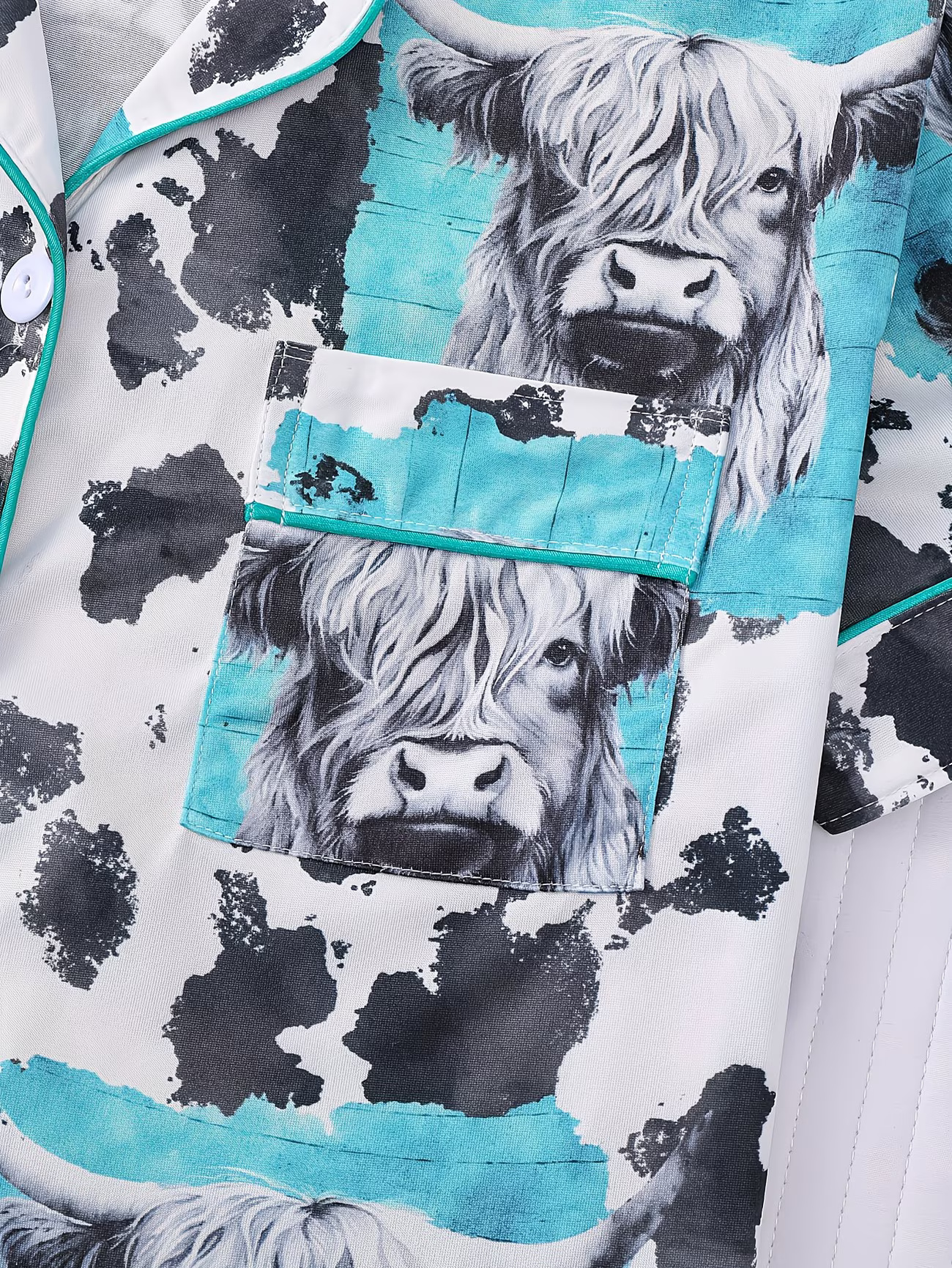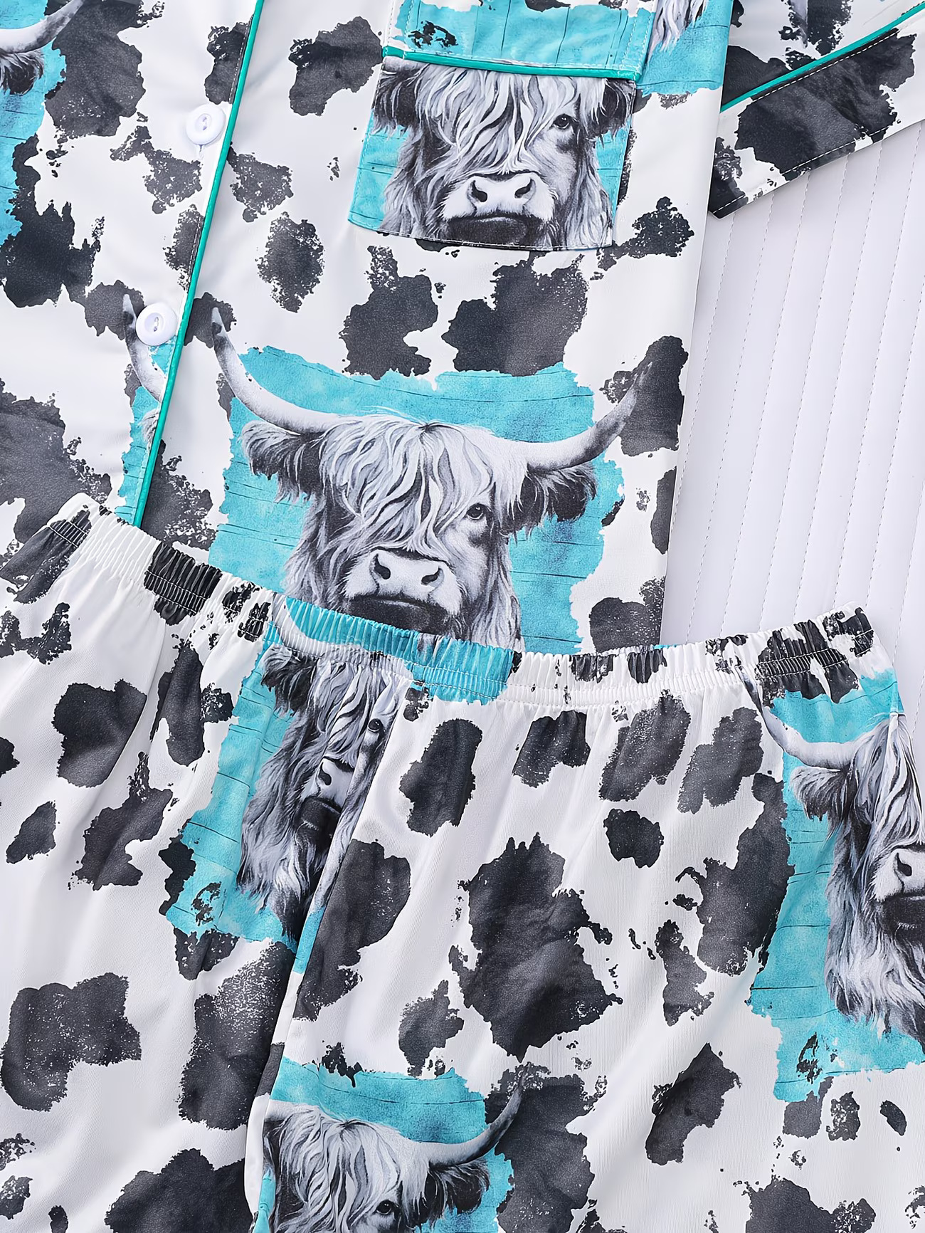 Add artistic charm to your home wardrobe with this Highland Cow Graphic Short Sleeve Sleepwear Set For Women. Designed with a distinctive animal cow ink pattern, this two-piece lounge set blends casual style with everyday functionality. The short-sleeved button-front shirt pairs effortlessly with loose elastic shorts for a coordinated look suitable for indoor and leisure activities.