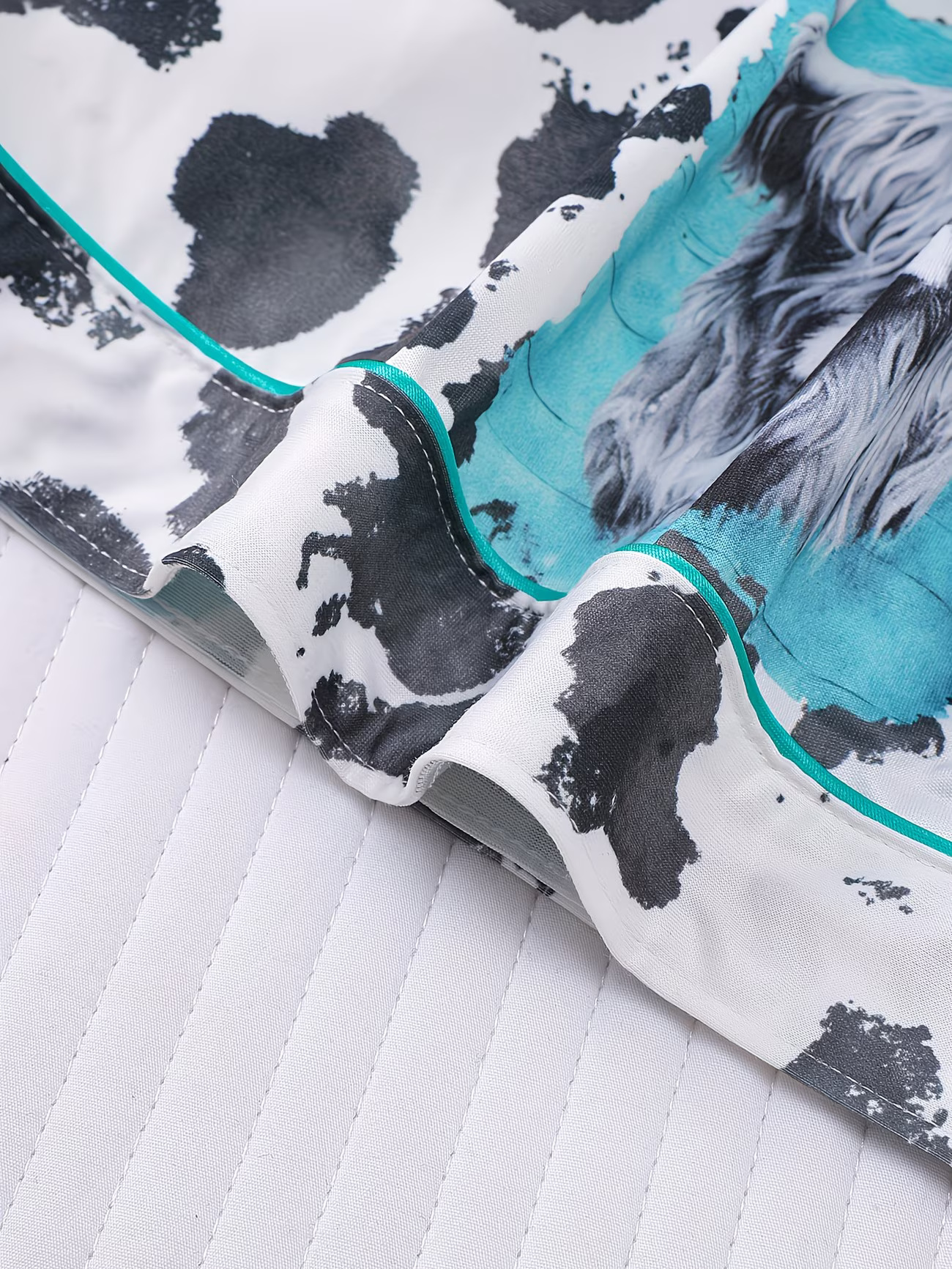 The Highland Cow Graphic Short Sleeve Sleepwear Set For Women offers a distinctive animal-inspired design with everyday practicality. Featuring a short-sleeve button-front shirt and elastic shorts, this knit fabric set provides flexible comfort and seasonal versatility. Ideal for adult women seeking themed loungewear, it combines artistic patterns with functional design in a complete two-piece outfit.