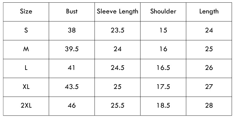 Size chart(inches):