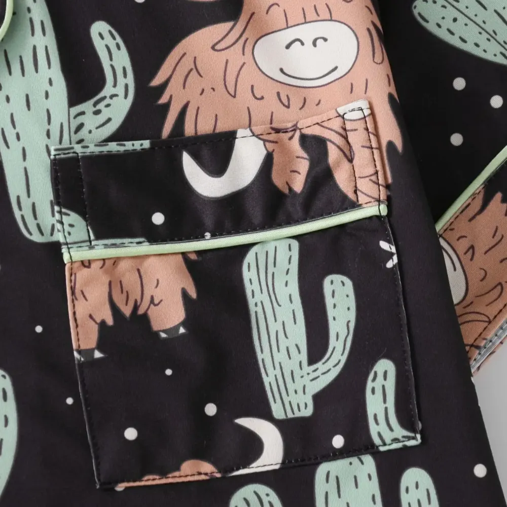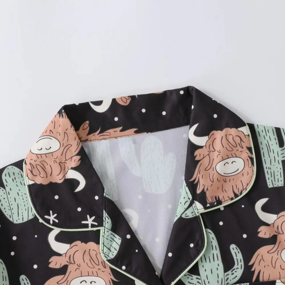 The Lightweight Two Piece Cartoon Yak And Cactus Printed Pajama Set is designed as a practical sleepwear option for everyday indoor use. It includes a short-sleeve button-front top paired with matching shorts, both featuring a coordinated cartoon yak and cactus print. The set offers a simple, structured design that supports consistent styling while remaining suitable for home-based routines.