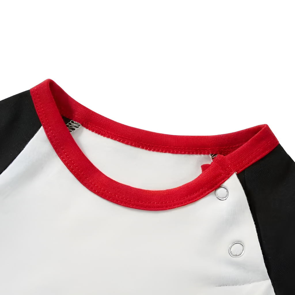 The tops feature contrast-colored sleeves, giving them a classic raglan silhouette suitable for all age groups. The bottoms follow a simple plaid design that adds a familiar seasonal pattern without overcomplication. Each piece has been developed to suit indoor activities where comfort, ease of movement, and visual coordination are desired.