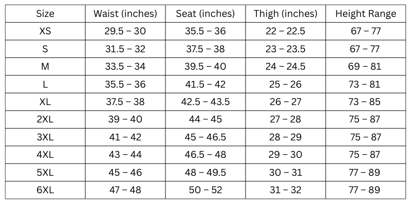 Size Chart (Inches):
