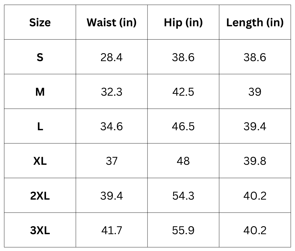 Size Chart (inches):