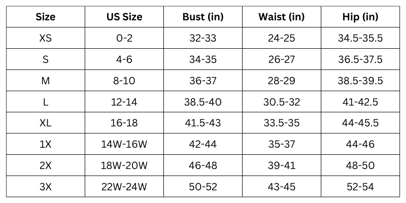 • Size XL: US 16-18, Bust 40-42", Waist 32-34"