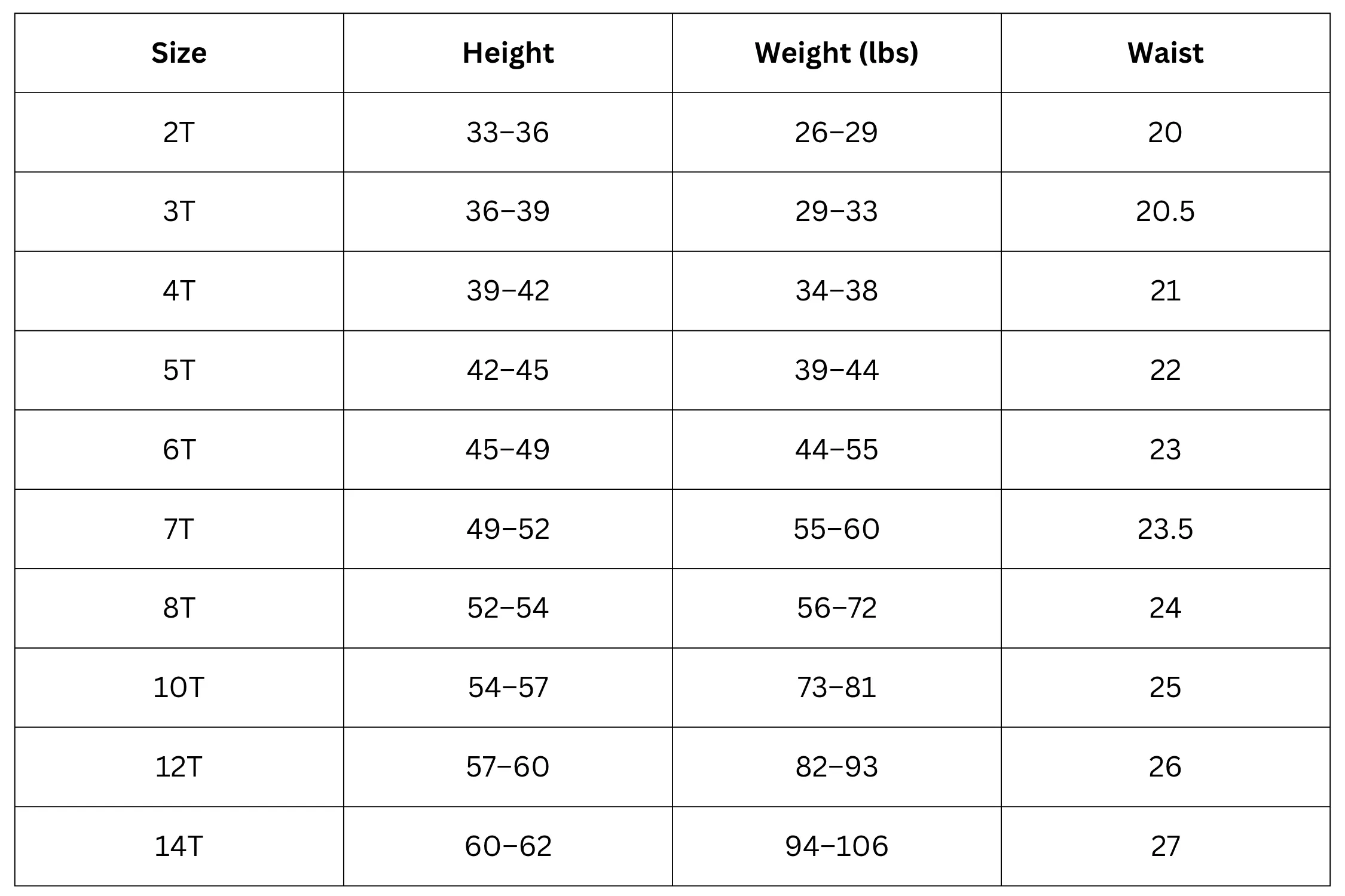 Kids Size Chart (Inches):