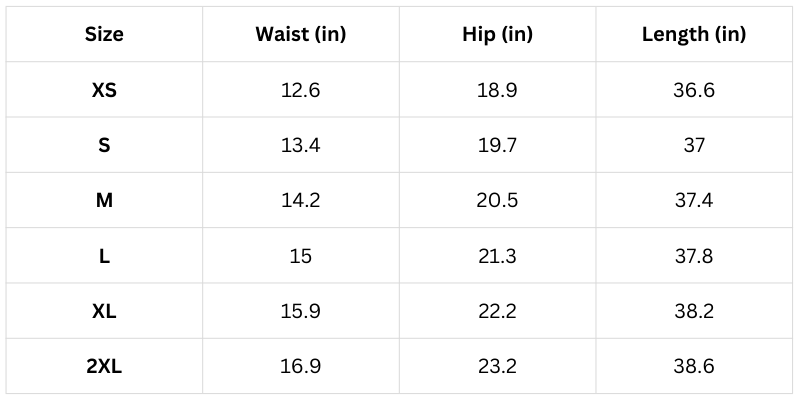 Size Chart (inches):