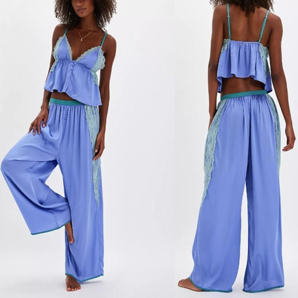 The design focuses on a neat appearance and easy wear. The cami-style top offers a lightweight upper piece, and the pants provide full-length coverage. The lace trim and ruffle detail add visual interest without requiring extra styling. Because this set comes as two separate pieces, you can also mix the top with other pants or pair the pants with other indoor tops. This makes the Lace Cami Pajama Set a flexible option for building an at-home wardrobe with coordinated pieces.