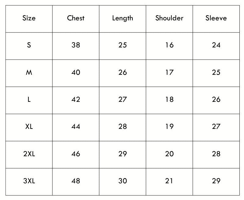 Size Chart (inches):