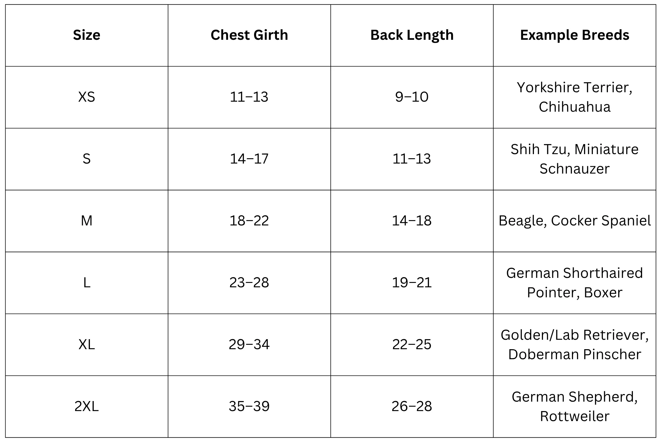 Dog Size Chart (Inches):