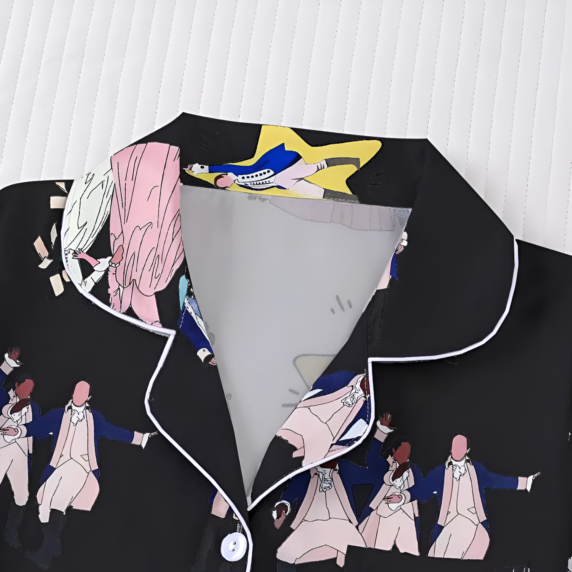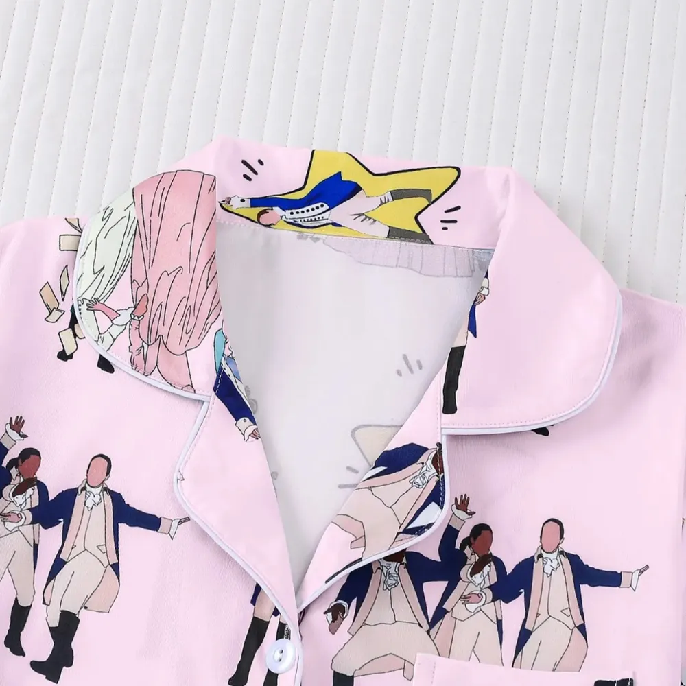 The Two Piece Casual Hamilton Musical Themed Pajama Set is designed as a coordinated outfit suitable for both indoor routines and nighttime wear. It features a short-sleeve button-front top paired with matching shorts, offering a consistent and structured look for everyday use at home. The all-over print is inspired by musical themes, adding a distinct visual pattern across both pieces.